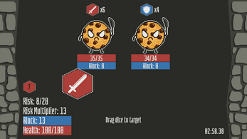 In combat, you have 3 main stats: Health, Block, and Risk. When your health hits 0, it's game over. Block just negates damage, but it doesn't persist from one combat to the next. Risk determines your risk multiplier, which is the multiplier for your dice rolls. The more risk you have, however, increases the chances of a negative consequence occurring each turn.